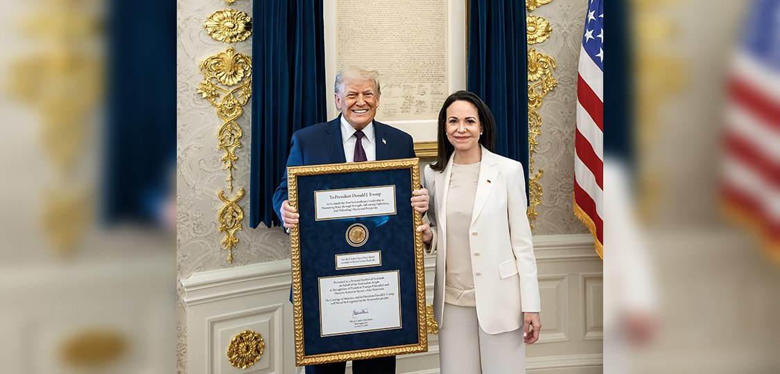 De acuerdo con una publicación de la Casa Blanca, durante la reunión, Machado le entregó formalmente al mandatario estadounidense la medalla de su Nobel de la Paz, como un reconocimiento por lo que ella considera su compromiso con la libertad y el apoyo a la causa democrática en Venezuela.