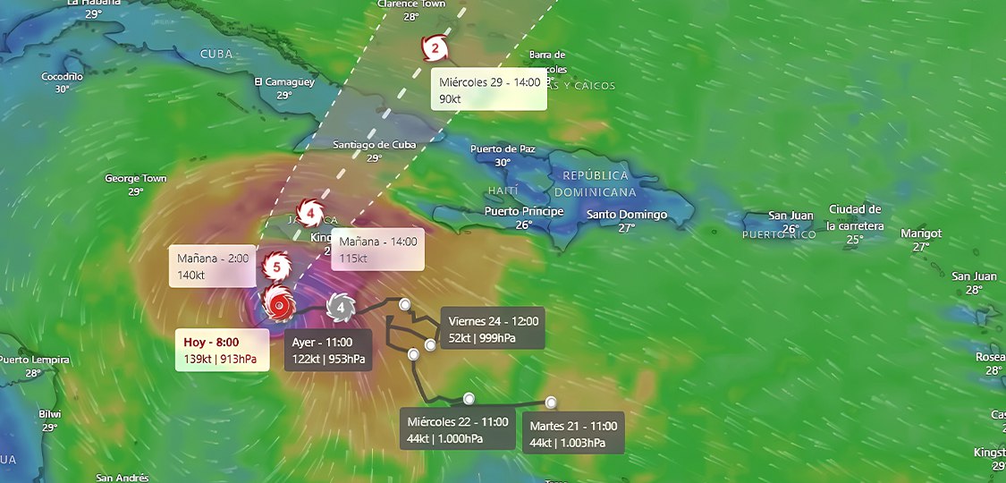 El ojo del huracán, de acuerdo al Indomet,»se ubica aproximadamente a unos 205 km al sur/suroeste de Kingston (Jamaica) y a unos 505 km al sur/suroeste de Guantánamo (Cuba). Se desplaza lentamente hacia el oeste, a unos 6 km/h, y la presión mínima central es de 917 milibares».