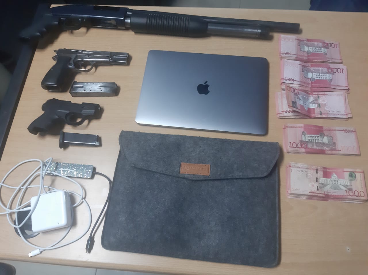 Luego de arresto, fueron recuperadas tres 3 armas de fuego: dos pistolas y una escopeta, así como una computadora laptop, indicó la institución del orden.