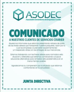 DIARIO ECO/SANTO DOMINGO, RD.- La Asociación Dominicana de Empresas Courier (ASODEC) informó a los clientes de dicho servicios que las compañías están teniendo «un inesperado atraso» en las entregas de sus mercancías debido a que a retrasos de parte de las líneas aEreas que transportan los paquetes.