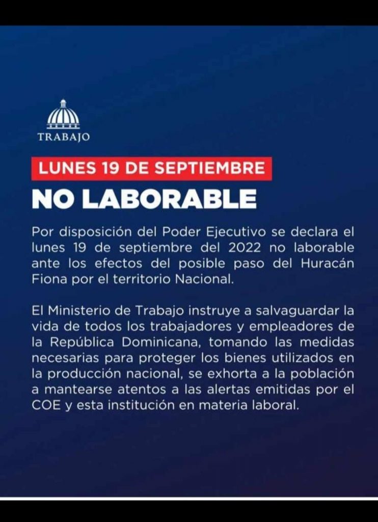 DIARIO ECO/SANTO DOMINGO, RD.- Debido al previsto paso del huracán Fiona por el territorio nacional, el Mikisterio de Trabajo, por disposición del Poder Ejecutivo dispuso la sucesión laboral para mañana lunes 19.