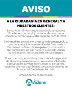 DIARIO ECO/SANTO DOMINGO, RD.- El Banco Ademi informó este viernes, a través de un comunicado, que el incendio registrado ayer en las instalaciones de la tienda L&R Comercial, ubicada en Villa Mella, no causó daños a su infraestructura ni a sus equipos, pero que la sucursal permanerá cerrada por el día de hoy para garantizar la seguridad de sus empleados y clientes.