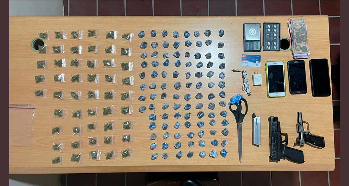 Añaden que en la escena también fue ocupada una balanza marca Elite-Maxus utilizada para comercializar sustancias prohibidas, también se halló en la parte inferior una pistola de marca y numeración ilegible, sin corredera, sin cañón y sin disparador, además una pistola deportiva marca Match, 4.5 milímetros y varios celulares, entre otras cosas.