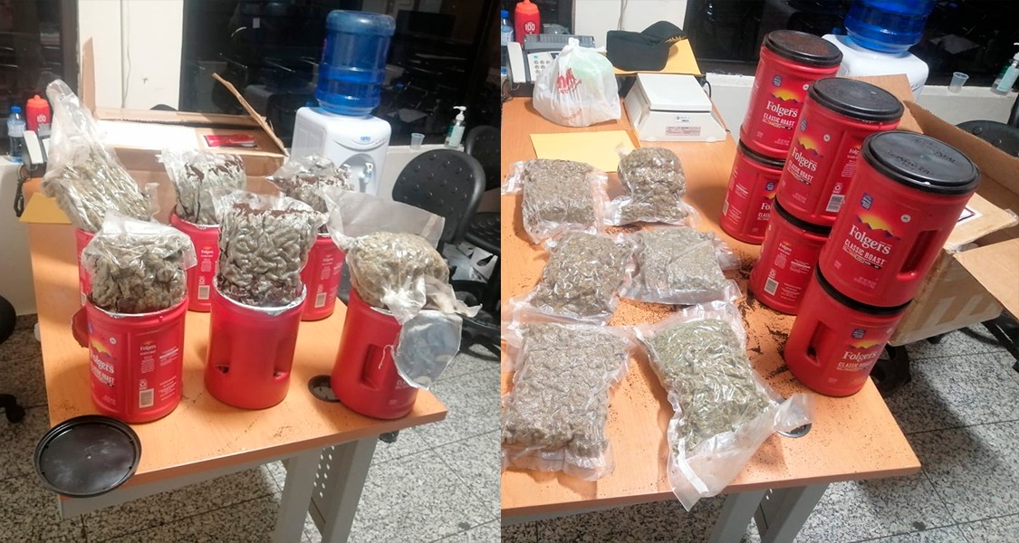 Agregan que, en presencia de un fiscal se procedió abrir la caja, donde se encontraron seis envases de plástico, que simulaban ser de café y en cuyo interior se ocuparon seis paquetes de marihuana, con un peso preliminar de ocho libras.