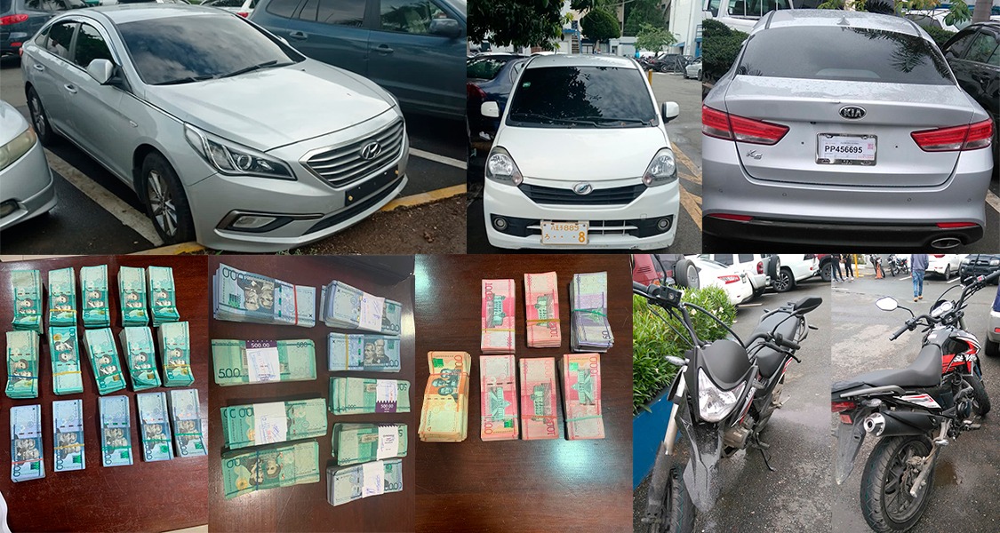 A los detenidos le fueron ocupados dos vehículos, una motocicleta, un furgón de neumáticos y la suma de RD$2,578,600, según la policía.