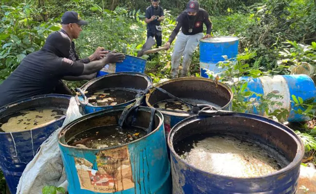 Los tanques en proceso de fermentación se encontraban ocultos entre la maleza para evadir la vigilancia de las autoridades, confirmando la intención criminal de los responsables de comercializar un producto letal en el mercado local.