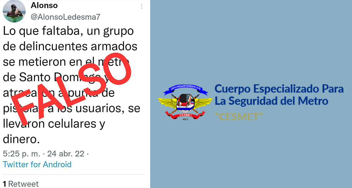 «El Cuerpo Especializado para la Seguridad del Metro y Teleférico de Santo Domingo (CESMET), informa que la publicación que circula en las redes sociales sobre un supuesto atraco en una de nuestras estaciones es totalmente FALSA», publicó la institución en su cuenta de Twitter.