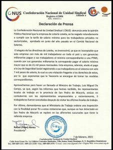 SANTO DOMINGO, RD.- La Confederación Nacional de Unidad Sindical (CNUS) denunció ante la opinión Pública Nacional que la empresa Lotería Loteka se niega a pagar la tarifa del salario mínimo a los trabajadores privados no sectorizados, cuya disposición fue aprobada en junio del año 2021 en el Comité Nacional de Salarios.