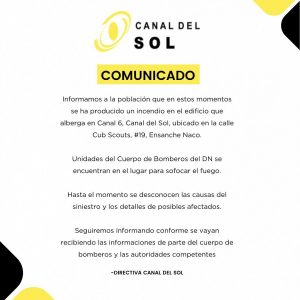 SANTO DOMINGO, RD.- Tras el incendio ocurrido la tarde de este martes, el Canal del Sol, que se transmite el Canal 6, emitió un comunicado explicando que se desconocen las causas del siniestro.