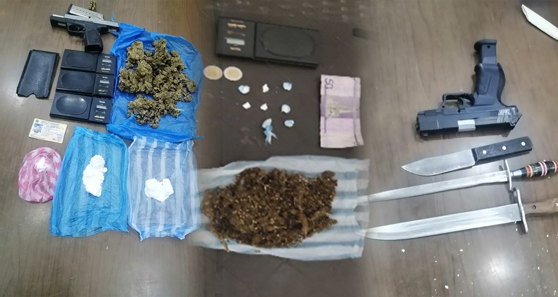 Los agentes actuantes reportan que a los detenidos le fueron confiscadas distintas sustancias prohibidas, balanzas, un arma de fuego y otra no letal, armas cortopunzantes, celulares y dinero.