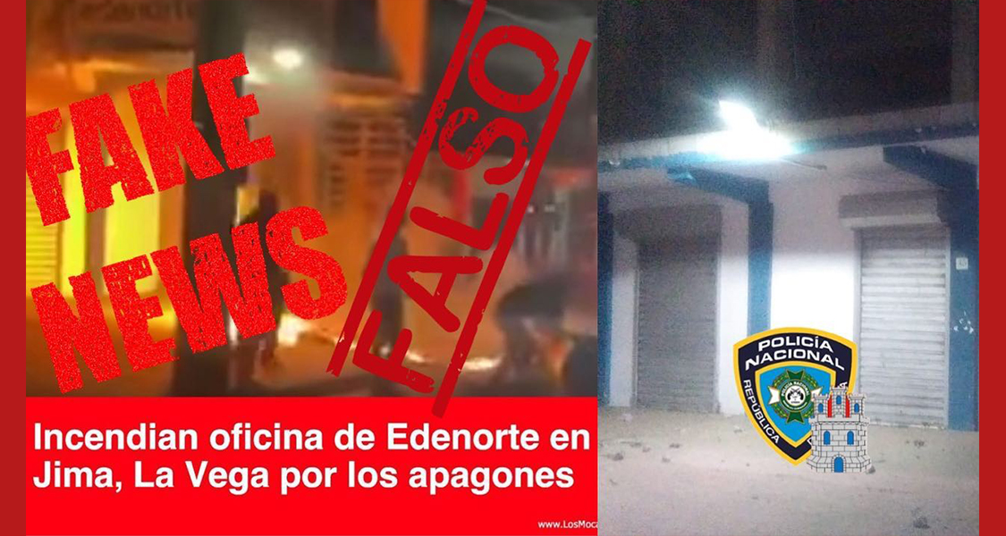 «Circula en las redes sociales un video donde colocaron el falso titulo, de que moradores de Jima abajo habrían incendiado la estafeta (oficina) de la Empresa Distribuidora de Energía Electica, Se trata de una información que no se corresponde con la realidad, es un hecho que no aconteció en esta localidad de la Vega,. Reiteramos que no es cierta la información, mientras que continuamos con los trabajos policiales para seguir garantizando la armonía de los residentes de esta provincia de la Vega», la información fue divulgada por la Policía en su cuenta oficial de Instagram.