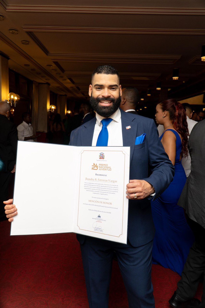 Durante la ceremonia fueron reconocidos jóvenes en 15 renglones distintos, destacándose la Mención de Honor otorgada a Jhondry Ferreras por su ejemplo de resiliencia, su vocación de servicio y su compromiso permanente con la juventud dominicana, demostrando que el verdadero liderazgo nace del esfuerzo y la coherencia.
