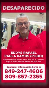 SANTO DOMINGO, RD.- Familiares del señor Eddy Rafael Pauna Ramos, mejor conocido Pildo, lo reportaron la mañana de este martes como desaparecido.