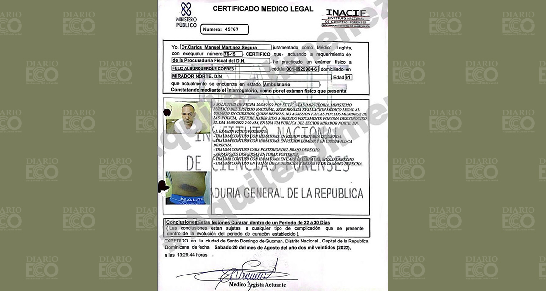 realizado por el Instituto Nacional de Ciencias Forenses (Inacif), Félix Alburquerque Comprés, presenta trauma contuso con hematoma en región orbitaria izquierda, trauma contuso con hematoma en región lumbar y en cresta iliaca derecha.