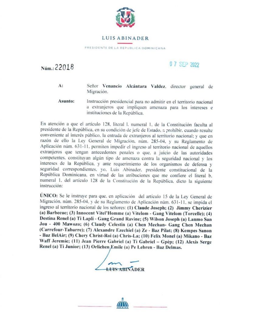 “Yo, Luis Abinader, presidente constitucional de la República Dominicana, en virtud de las atribuciones que me confiere el literal b, numeral 1, del artículo 128 de la Constitución de la República dicto la siguiente instrucción”, dice el mandatario cuando solicita impedir el ingreso al territorio nacional de Claude Joseph, Jimmy Cherizier alias Barbecue; Innocent Vitel’Homme, conocido como Vitelom – Gang Vitelom (Torcelle); Destina Renel alias Ti Lapli – Gang Grand Ravine; Wilson Joseph conocido como Lanmo San Jou, de la banda 400 Mawozo.