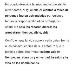«No puedo describir la impotencia que siento al ver cómo, al igual que él, cientos o miles de personas fueron defraudadas por quienes tenían la responsabilidad de proteger su salud. No solo les robaron dinero: les arrebataron tiempo, alivio, vida. Confío en que la vida pone a cada quien frente a las consecuencias de sus actos. Y que la justicia sabrá determinar cuánto vale en tiempo, en recursos y en verdad, la salud y la vida de los dominicanos», externó.