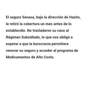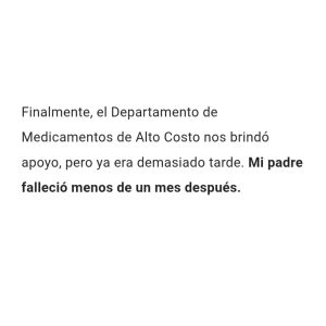 Jennifer prosiguió relatando que, después de las tantas denuncias que realizó, el Departamento de Medicamentos de Alto Costo le brindó apoyo, pero ya era demasiado tarde, su padre falleció menos de un mes después.