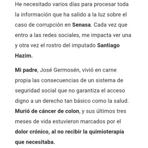 «Mi padre, José Germosén, vivió en carne propia las consecuencias de un sistema de seguridad social que no garantiza el acceso digno a un derecho tan básico como la salud. Murió de cáncer de colon, y sus últimos tres meses de vida estuvieron marcados por el dolor crónico, al no recibir la quimioterapia que necesitaba. El seguro Senasa, bajo la dirección de Hazim le retiró la cobertura un mes antes de lo establecido. No trasladaron su caso al Régimen Subsidiado, lo que nos obligó a esperar a que la burocracia permitiera renovar su seguro y acceder al programa de Medicamentos de Alto Costo», narró.