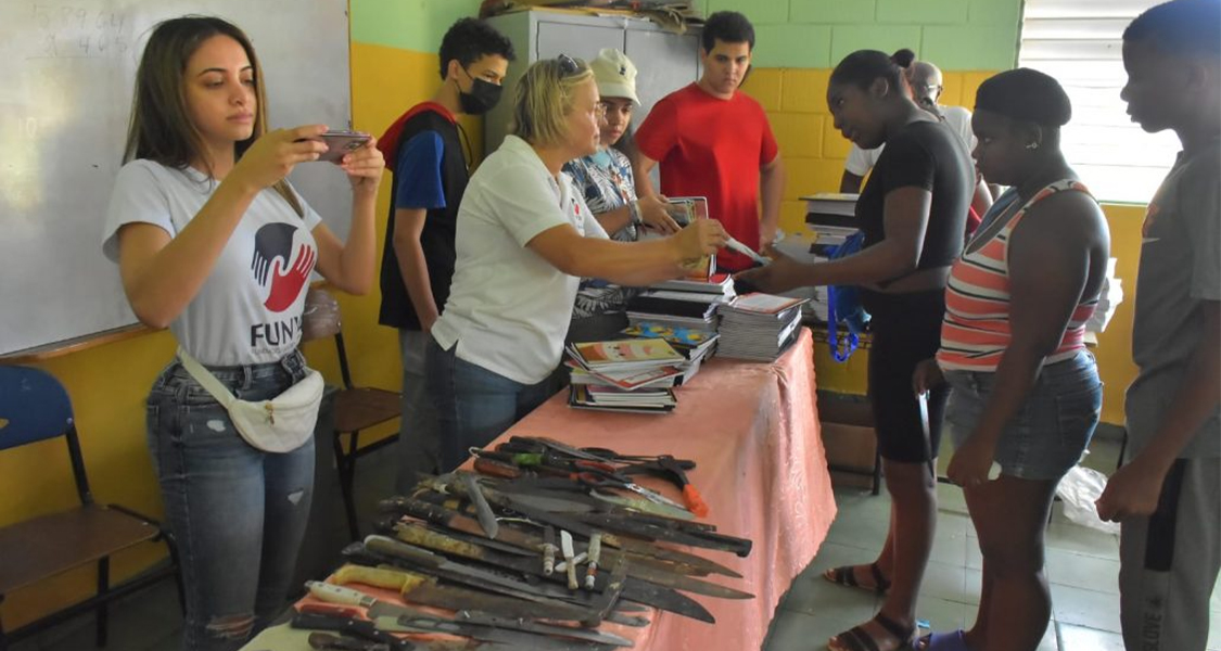 DIARIO ECO/SANTO DOMINGO, RD.- A semanas de iniciar el año escolar 2022-2023 y con el propósito de aportar «un granito de arena», la Fundación Vargas Almonte (Funva) realizó el acostumbrado operativo durante el fin de semana que consistió en un trueque de armas blancas por cuadernos.