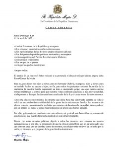 A través de un post colgado en su cuenta de Twitter el exmandatario compartió una carta dirigida al presidente, Luis Abinader y la primera dama, Raquel Arbaje, a los obispos y sacerdotes, a los dirigentes políticos de distintas agrupaciones, asi como a sus compañeros de partido.