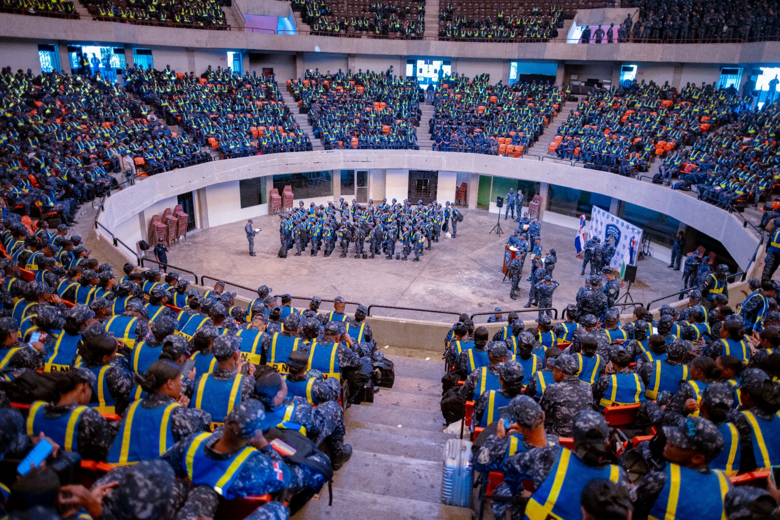 El acto de concentración y salida del personal se realizó en el Coliseo de Boxeo Carlos Teo Cruz, donde desde tempranas horas se reunieron jóvenes policías, hombres y mujeres, preparados para integrarse a los distintos puntos estratégicos del país. Los agentes, uniformados y con su equipaje, fueron organizados para su traslado hacia zonas de alta afluencia poblacional.