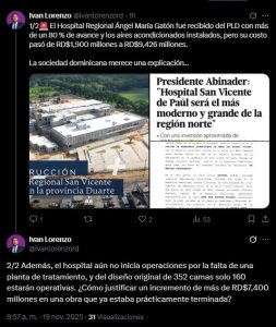 «El Hospital Regional Ángel María Gatón fue recibido del PLD con más de un 80 % de avance y los aires acondicionados instalados, pero su costo pasó de RD$1,900 millones a RD$9,426 millones. La sociedad dominicana merece una explicación…», cuestionó.