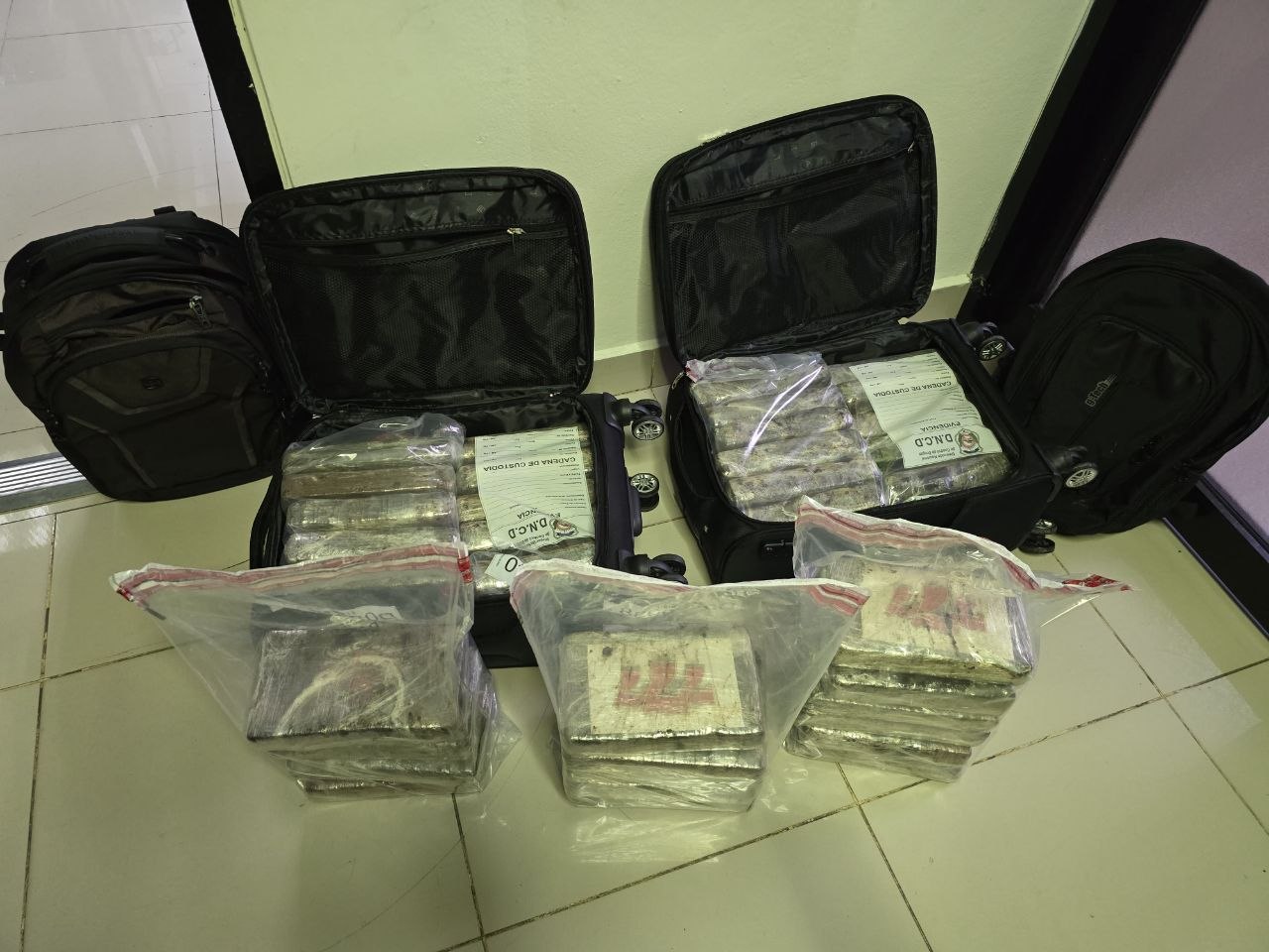 Por instrucciones del fiscal, en presencia de los imputados, se procedió a realizar el proceso de apertura de los equipajes, ocupando en las mochilas y las maletas, un total de 37 paquetes de la sustancia, forrados en cinta adhesiva marcados con varios logotipos.