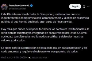 «Este Día Internacional contra la Corrupción, reafirmamos nuestro inquebrantable compromiso con la transparencia y la ética en el servicio público al que hemos dedicado gran parte de nuestra vida. Hoy más que nunca se impone fortalecer los controles institucionales, la rendición de cuentas y la integridad en cada entidad del Estado. Como sociedad, también estamos llamados a cultivar y defender nuestros valores y principios», instó.