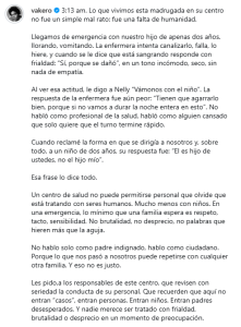 Vakeró dijo que en horas de la madrugada fue a la Clínica de Salud e Imágenes Diagnóstica (CLISID) junto a su hijo, que estaba vomitando, y la enfermera trató de canalizarlo, pero no pudo, logrando herirlo. Tras esto, le dijeron que estaba sangrando y ella contestó, con un tono cargado de frialdad: «Sí, porque se dañó», actitud que tildó de «falta de humanidad».