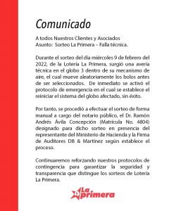 SANTO DOMINGO, RD.- La lotería La Primera de LOTODOM a través de un comunicado dijo que el sorteo de ayer miércoles 9 de febrero del presente año presentó una falla técnica, lo que provocó una avería en el globo 3 dentro de su mecanismo de aire, impidiendo el movimiento aleatorio de los bolos antes de ser sacados de la tómbola.