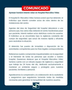 «Reiteramos nuestro compromiso inquebrantable con la seguridad y el bienestar de todas las personas que acuden a nuestro hospital. Queremos destacar que el Hospital Marcelino Vélez Santana cuenta con un robusto equipo de vigilancia y seguridad que trabaja las 24 horas del día, dedicado exclusivamente a mantener un ambiente seguro y protegido par anuestros pacientes, familiares y personal», aseveró.