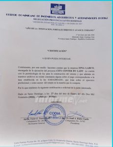 La petición de información surge luego de que el Colegio Dominicano de Ingenieros, Arquitectos y Agrimensores (CODIA), Delegación Provincia Santo Domingo, emitiera una certificación en la que afirma que la empresa EPSA LABCO, responsable de la ejecución del proyecto City Center by Lady, no cuenta con la permisología de ley requerida para la construcción de la obra.