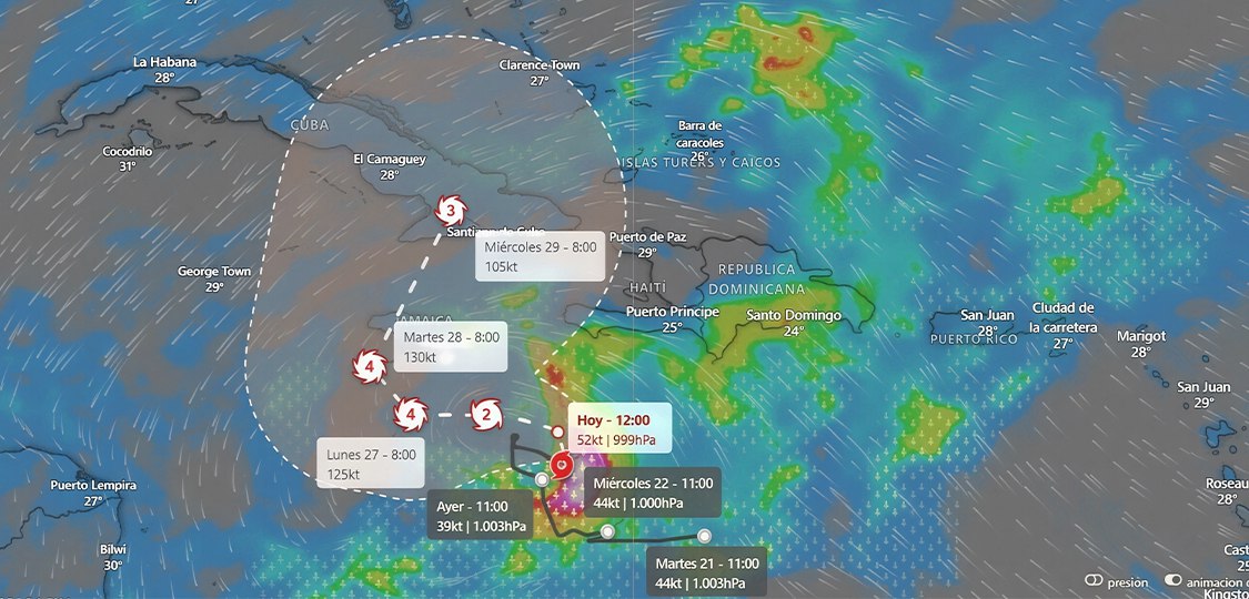 El experto explicó que en las últimas horas Melissa ha comenzado a moverse hacia el este/sureste, es decir, a bajar un poco hacia el sur de Haití, al tiempo de señalar que unos sistemas anticiclonicos están haciendo que el fenomeno se mueva en esa dirección, lo que ha provocado la dismisución de lluvias en las ultimas horas, sin embrago, los vientos cortantes en altura favorecera que Melissa alcalce la categoria de huracán en los ultimos días.