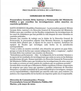 SANTO DOMINGO, RD.- Ante la conmoción que han causado las muertes de al menos tres personas en distintos destacamentos policiales del país, la procuradora general de la República, Miriam Germán Brito dispuso la investigación de estos sucesos, en los que están involucrados agestes de la Policia Nacional.