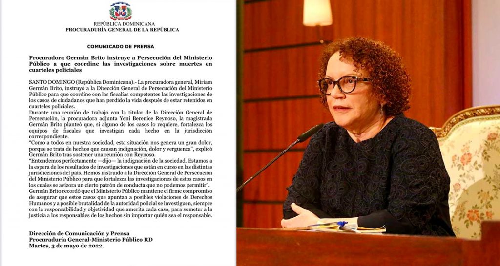 SANTO DOMINGO, RD.- Ante la conmoción que han causado las muertes de al menos tres personas en distintos destacamentos policiales … Sigue leyendo Miriam Germán ordena investigaciones sobre muertes en cuarteles policiales
