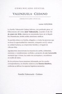 Así lo dio a conocer, a través de un comunicado, la familia Valenzuela Cedano. En el documento agradecieron a las personas que se han solidarizado y manifestaron que darán a conocer más adelante los detalles relativos a las honras fúnebres.