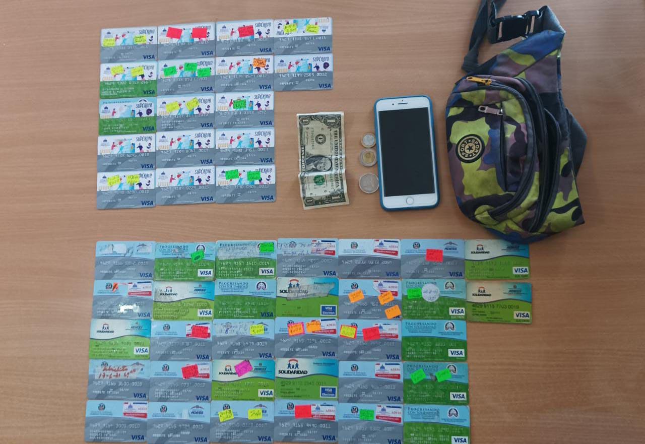 Al detenido le fue ocupado un bulto tipo cangurera, el cual contenía 32 tarjetas del «Plan Quédate en Casa» y 17 del plan «Supérate», por lo que fue remitido al Departamento de Investigaciones de Crímenes y Delitos de Alta Tecnología (DICAT), para fines de lugar.