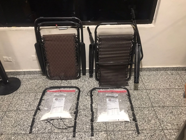 Tras el hallazgo, y en presencia de un fiscal, abrieron la caja encontrando dentro dos sillas playeras, cuyos tubos estaban rellenos de cocaína, con un peso aproximado de un kilo, según el análisis del Instituto Nacional de Ciencias Forenses (INACIF).