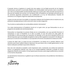Ante la respuesta del presidente de la República, Luis Abinader, sobre el reclamo de la población por el alto costo de la vida, Omar Fernández señaló que «Petrocaribe» no influía en los precios finales de los combustibles, sino que permitía financiar el sobreprecio.