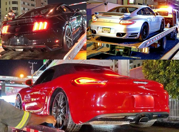 Entre los vehículos retenidos y fiscalizados por violar la Ley de Tránsito 63-17 se encuentran varios Porches, Ford Mustang, Jeepeta Range Rover, Mercedes Benz, BMW (carro y jeepeta), Audi, LEXUS, Doge y Jeepeta Volvo.