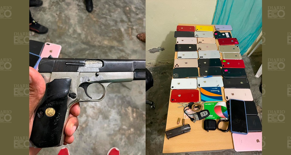 Los detenidos fueron identificados como Wander de los Santos Arnold, alias Juan Dom, de 24 años, a quien se le ocupó una pistola de marca y numeración limada, calibre 9mm, con su cargador dos cápsulas y Ariel Emerejildo Polanco, de la misma edad, a quien se le ocuparon 27 celulares de la marca IPhone y dos hojas de chaleco antibalas.