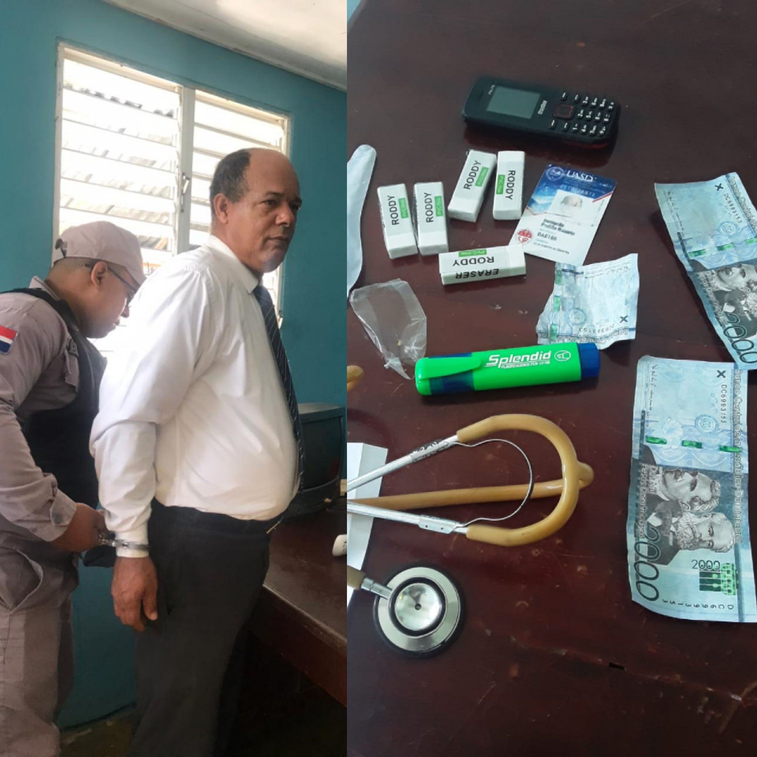 Mediante un comunicado enviado por la Dirección Regional Cibao Central, agentes policiales apuntaron que le ocuparon a Padilla Rosario en el interior de una funda, un estetoscopio, una tijera, una gorra de camuflaje, un celular y la suma de RD$4,000.00 pesos supuestamente falsos, en denominaciones de 2,000.00.