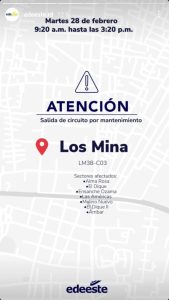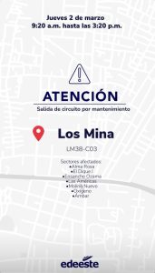 Las zonas perjudicadas por la salida del circuito Los Minas (LM-38-C03) son: Alma Rosa, El Dique l, Ensanche Ozama, Las Américas, Molino Nuevo, Oxígeno y Ámbar.