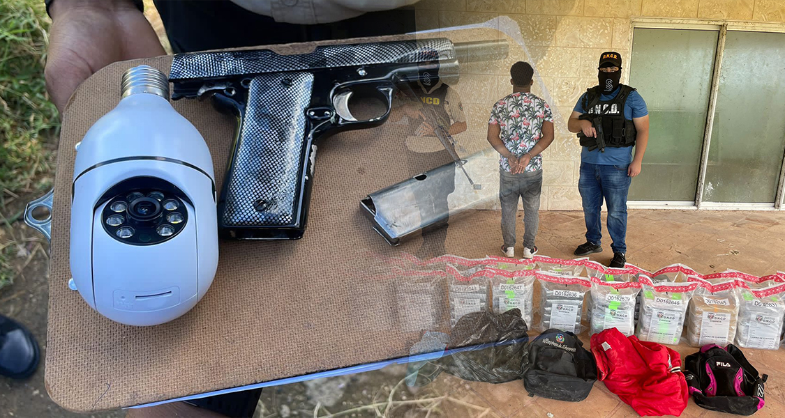 Posteriormente, las autoridades realizaron un allanamiento en una Villa, en las cercanías donde se incautaron los paquetes, encontrando dentro de la residencia una pistola calibre 45, sin marca legible, un bombillo con cámara integrada, una camioneta marca Ford, placa L327006, color azul y una motocicleta, negra, placa K0173371.