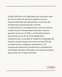 En relación con los señalamientos sobre mi situación patrimonial y el ejercicio de mis funciones públicas, explicó que desde el día en que nació he residido en el sector Gazcue. En el mismo edificio donde actualmente vive, su familia es propietaria desde el año 2007, y residió en ese inmueble desde el año 2014 hasta poco después de incorporarse al gobierno. «Esto puedo probarlo, pues lo único que hemos hecho en mi familia es trabajar con honestidad», añadió.