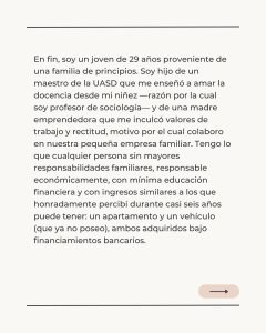 Sostuvo que en el año 2023 adquirió, en ese mismo edificio, un apartamento modesto de dos habitaciones, ubicado contiguo al apartamento de sus padres, por un valor aproximado de RD$10,735,000.00. Dicha adquisición fue financiada mediante una operación crediticia ordinaria: un préstamo hipotecario equivalente al 80% del valor del inmueble y un préstamo personal para cubrir el 20% del inicial.