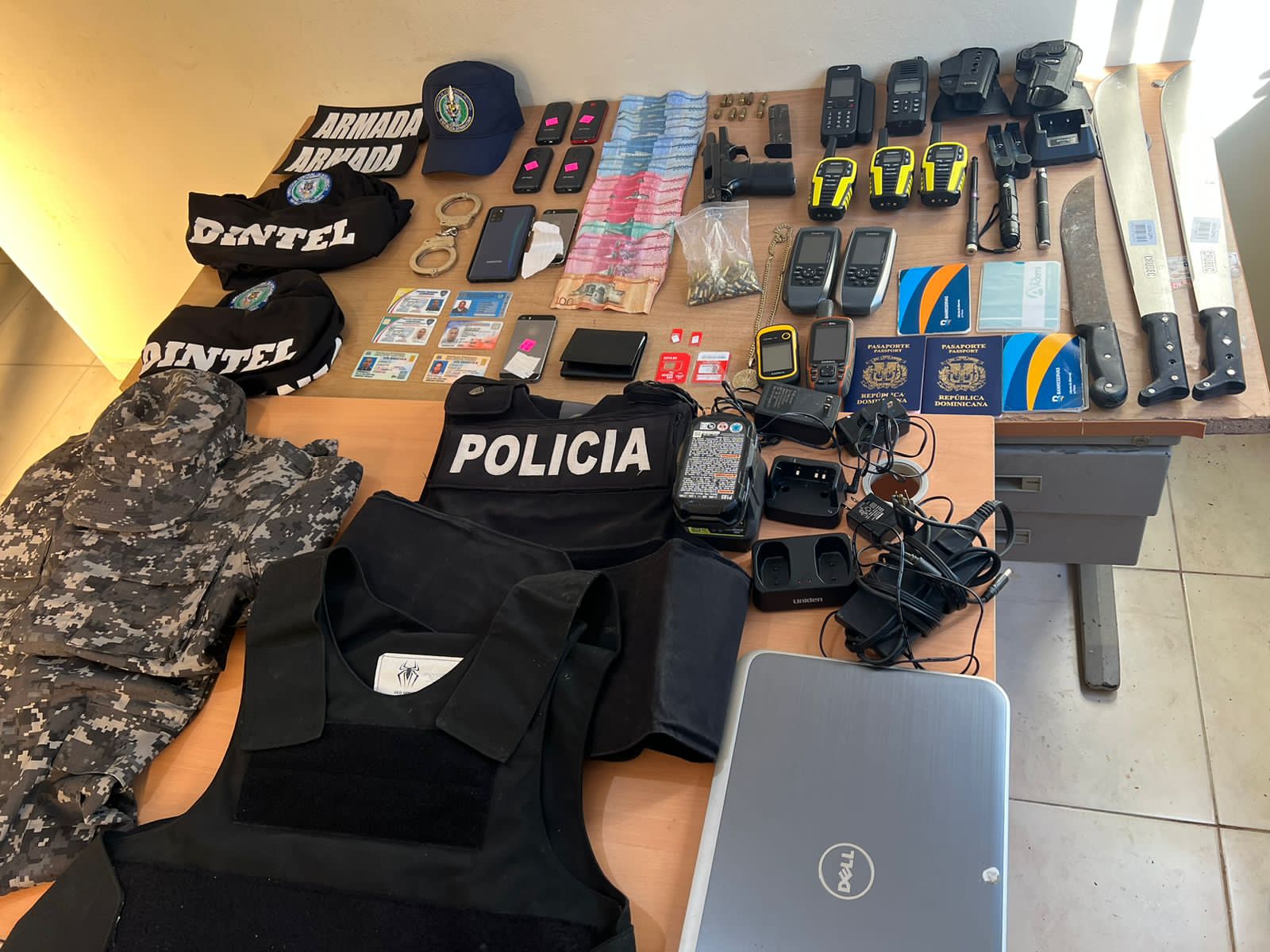 De acuerdo al informe, durante el apresamiento, se les ocupó, además, una pistola con su cargador marca Pietro Beretta, así como también nueve capsulas de 9 milímetros, 112 balines para rifles, varios celulares y tarjetas de dos bancos comerciales, tres machetes, dos focos láser, una gorra con el logo DINTEL, ocho cargadores para radio de comunicación y celulares, un vehículo marca Jeep Wrangler, una lancha de 15 pies de largo con su remolcador, entre otras.