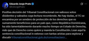 «Positiva decisión del Tribunal Constitucional con valiosos votos disidentes y salvados cuya lectura recomiendo. No hay dudas, el TC se encamina por un sendero de protección de los derechos que es sumamente beneficioso para un país que, como República Dominicana, ha sido lamentablemente durante mucho tiempo un Estado de Derecha, más que de Derecho como quiere y manda la Constitución», difundió en su cuenta de X.