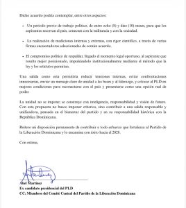 DIARIO ECO/SANTO DOMINGO, RD.- En una carta dirigida al presidente del PLD, Danilo Medina, y al Secretario General, Johnny Pujols, el aspirante presidencial Abel Martínez propuso un acuerdo político voluntario entre los aspirantes presidenciales para fortalecer la unidad y la fortaleza electoral del partido de cara a las elecciones de 2028.