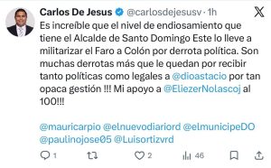 DIARIO ECO/ SDE: El exdiputado Carlos de Jesús lanzó fuertes críticas contra el alcalde de Santo Domingo Este, Dío Astacio, a través de su cuenta en la red social X, tras la presunta militarización del Faro a Colón, luego de que Eliezer Nolasco, gobernador del Faro a Colón, votara a favor de la continuidad de Adán Peguero como presidente del PRM en Santo Domingo Este.